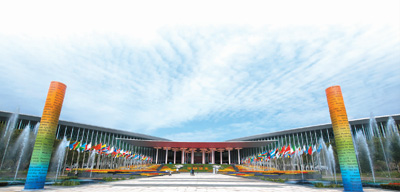 11月4日,国家会展中心(上海)南广场,大型花坛内鲜花怒放,各国国旗迎风招展。